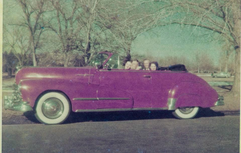 1947 Pontiac Convertible. Don (Dad) and Sheldon (Uncle) courting Mary Lou (Mom) and her sister Stella (Auntie) after they escorted brother Frank to California. They swung back thru Denver and met their future wives. Mom and Dad in front, Aunt Stella/Uncle Sheldon in the back. Mighty fine looking ride!
